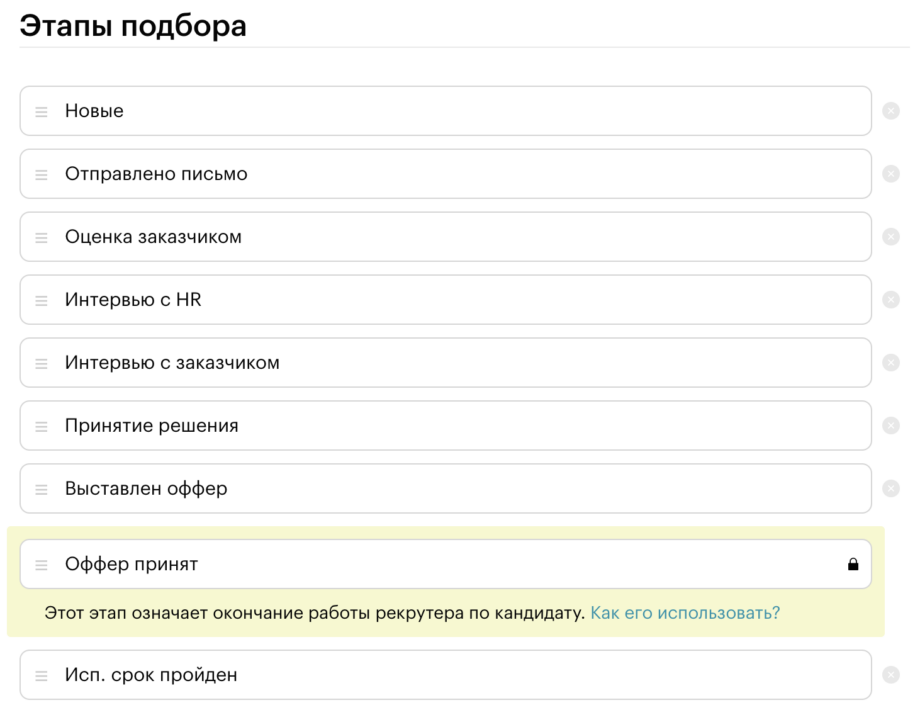 Этапы подбора в ATS — это список шагов, которые проходит кандидат у вас в компании. Вы сами создаете этот список под свой процесс. Например:
