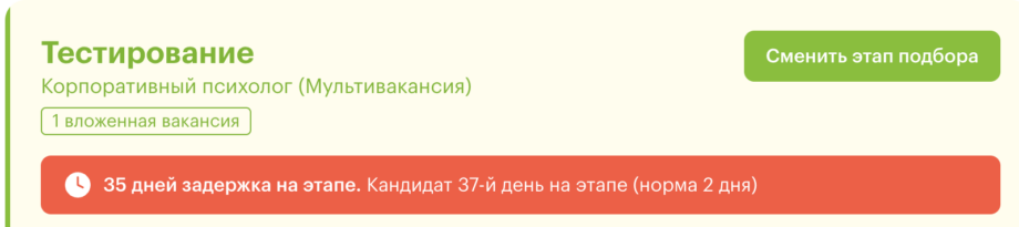 В ATS Хантфлоу также можно получать напоминания о том, что кандидат застрял на этапе. Система укажет на это и в карточке кандидата: там появится предупреждение, например, «Кандидат находится на этапе уже 19 дней при норме в 5». Это видно и рекрутеру, и заказчику, если он приглашен на этот этап.