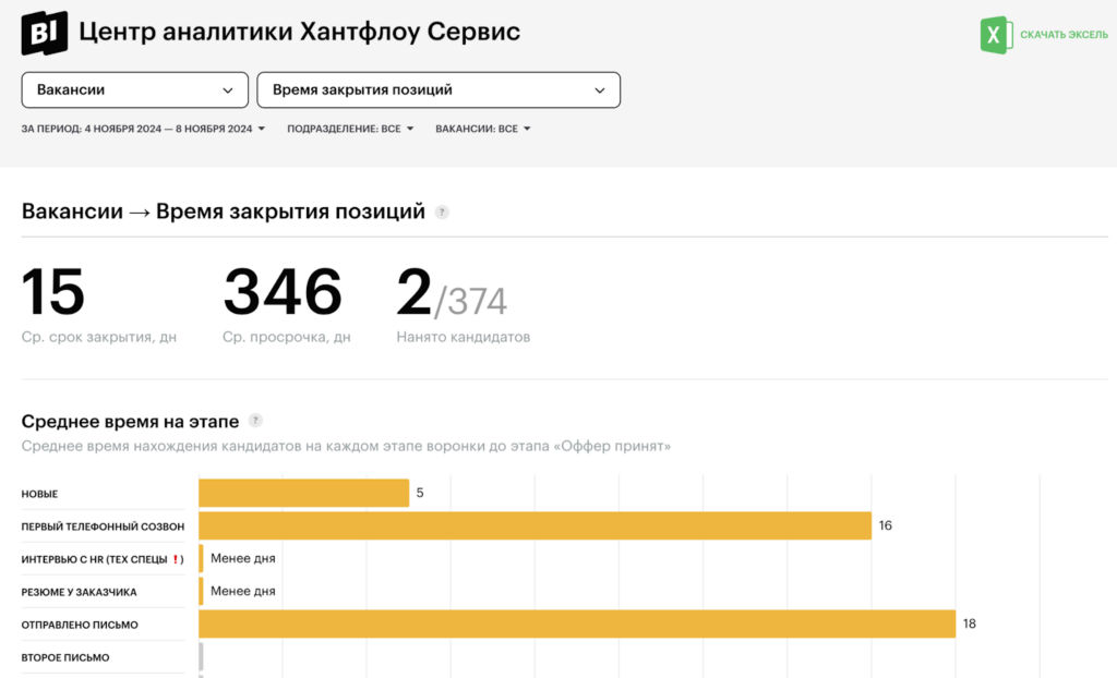Данные можно выгрузить в Excel для детального анализа или интегрировать с аналитическими платформами через открытые API. Отчет помогает оценивать эффективность подбора и выявлять возможности для его ускорения.