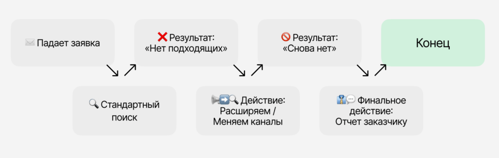Я часто вижу, как компании фиксируют заявку на подбор на бумаге, пересылают по почте или просто сообщают требования устно. Рекрутеру приходится начинать поиск по этим скудным вводным, что часто приводит к ошибкам. Поэтому первый шаг — обязательно фиксировать заявку в системе.