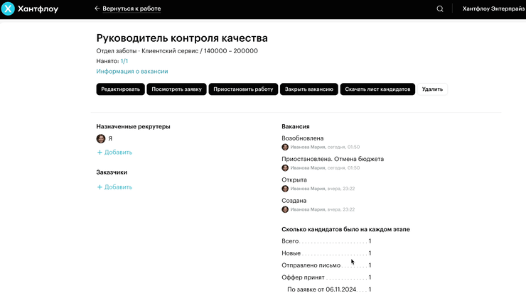 Если вы тоже хотите ускорить подбор, снизить текучесть и улучшить опыт кандидатов — переходите на Хантфлоу. В системе уже есть все необходимое для этого: единый контур согласований, публикация вакансий на джоб-площадки в пару кликов, удобная запись кандидатов на интервью и цифровые офферы.