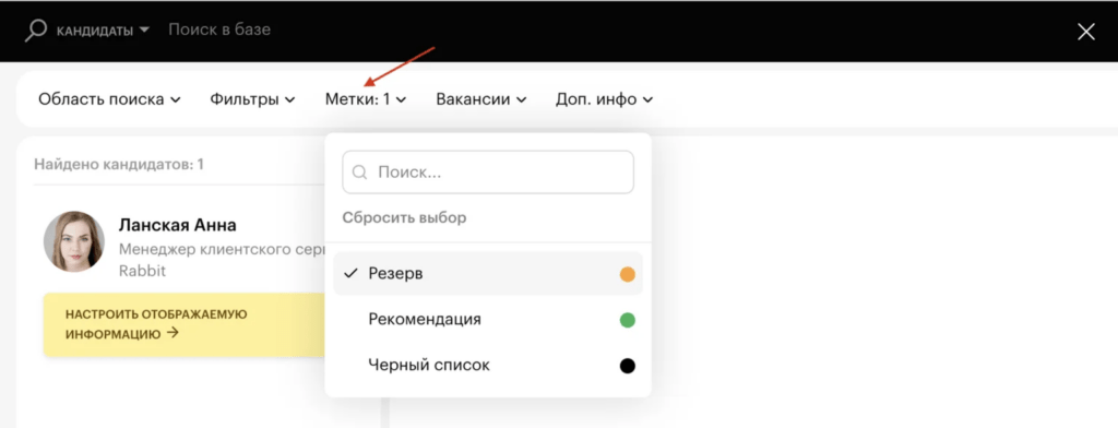 Например, добавьте сильным кандидатам метку «Резерв». Когда появится подходящая вакансия, вы одним кликом сможете обратиться к ним, не тратя лишние ресурсы.