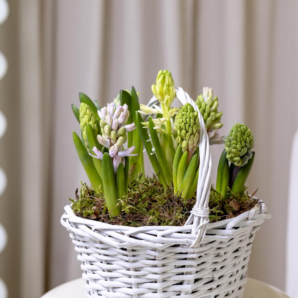 Например, луковичные растения в корзинах с землей — тюльпаны, гиацинты, нарциссы. Они не требуют сложного ухода и долго радуют глаз. А получатели могут наблюдать, как растения живут и распускаются.