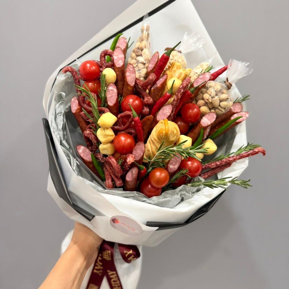 Фуд-флористы делают композиции из ягод, фруктов, конфет, орехов, сухофруктов, сыров, колбас и даже раков. Такой подарок одновременно выглядит эффектно и не увядает — его можно разделить с коллегами или забрать домой.