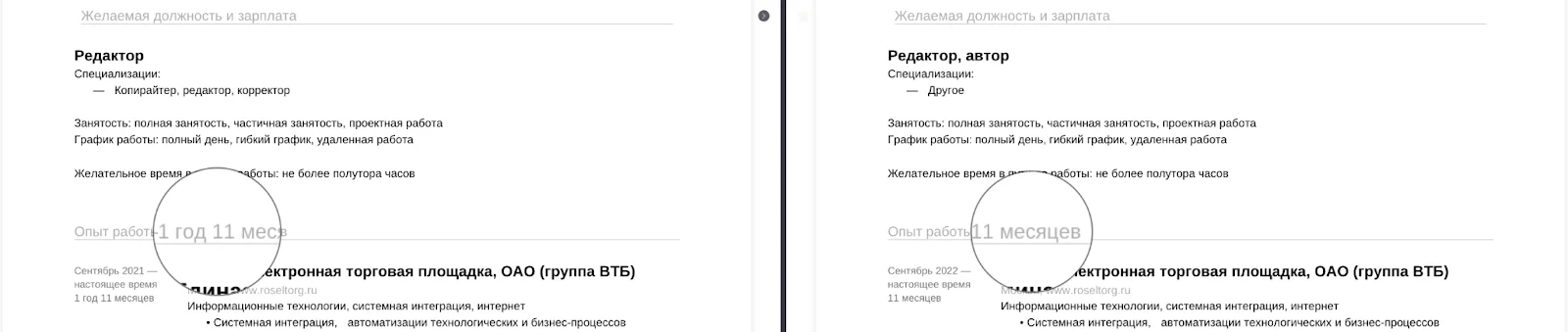 Некоторые кандидаты дополняют резюме ложной информацией: добавляют проекты, которых не было, или увеличивают количество лет в профессии. Функция поиска дубликатов резюме в Хантфлоу помогает быстро понять, что специалист уже откликался на вакансии раньше, сравнить его резюме и заметить несоответствия.