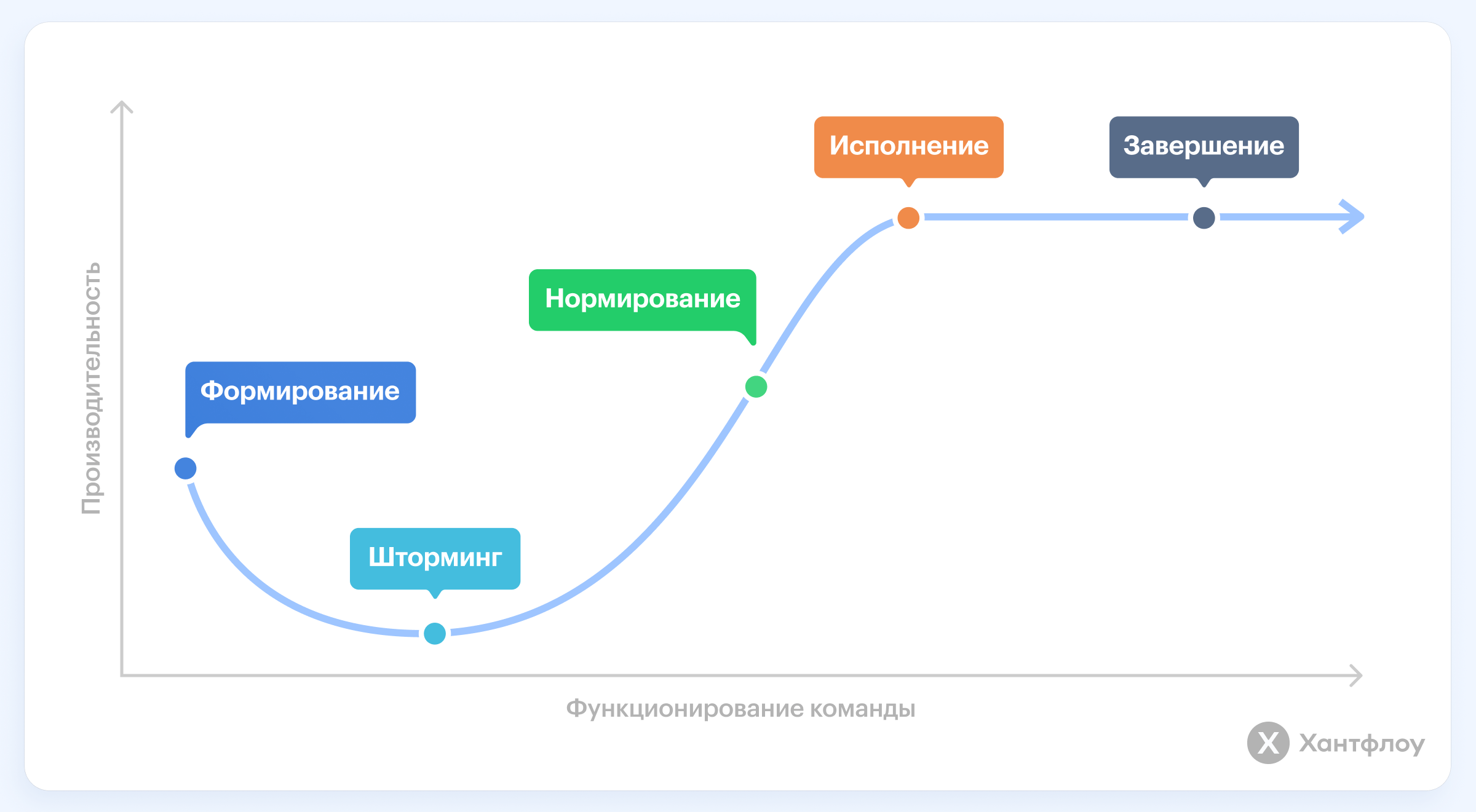 Согласно модели Брюса Такмана, команда начинает слаженно работать не сразу: сначала люди знакомятся, затем возникают разногласия. Только после этого закрепляются рабочие договоренности и выходят на стабильный темп.