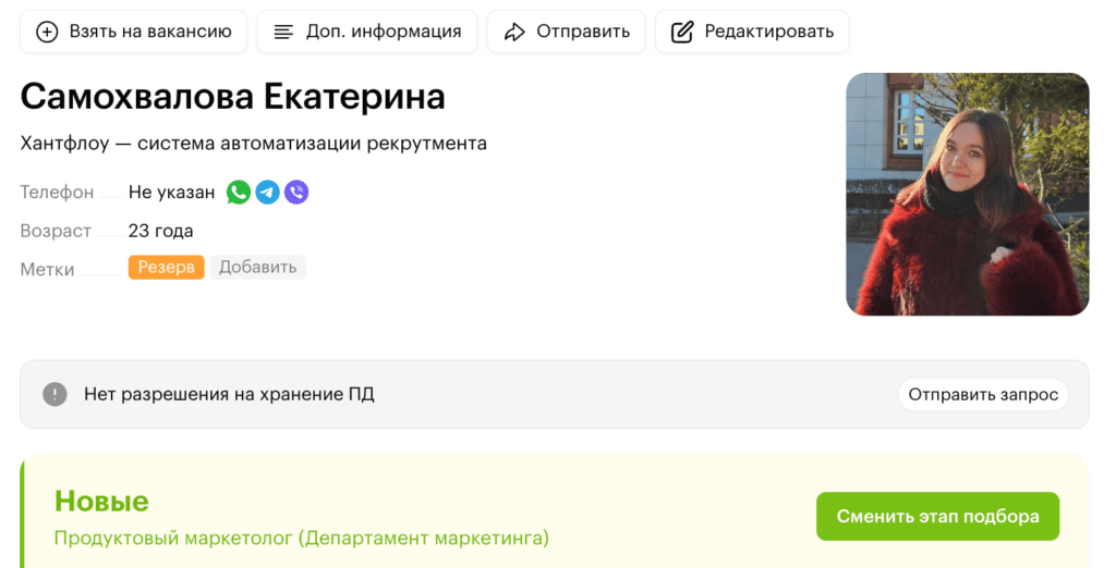 Один из самых частых сценариев использования меток — работа с кадровым резервом. Допустим, вы пообщались с сильным кандидатом, но подходящей вакансии для него пока нет. Терять ценный контакт не хочется. Решение простое: присвойте кандидату метку «Резерв».