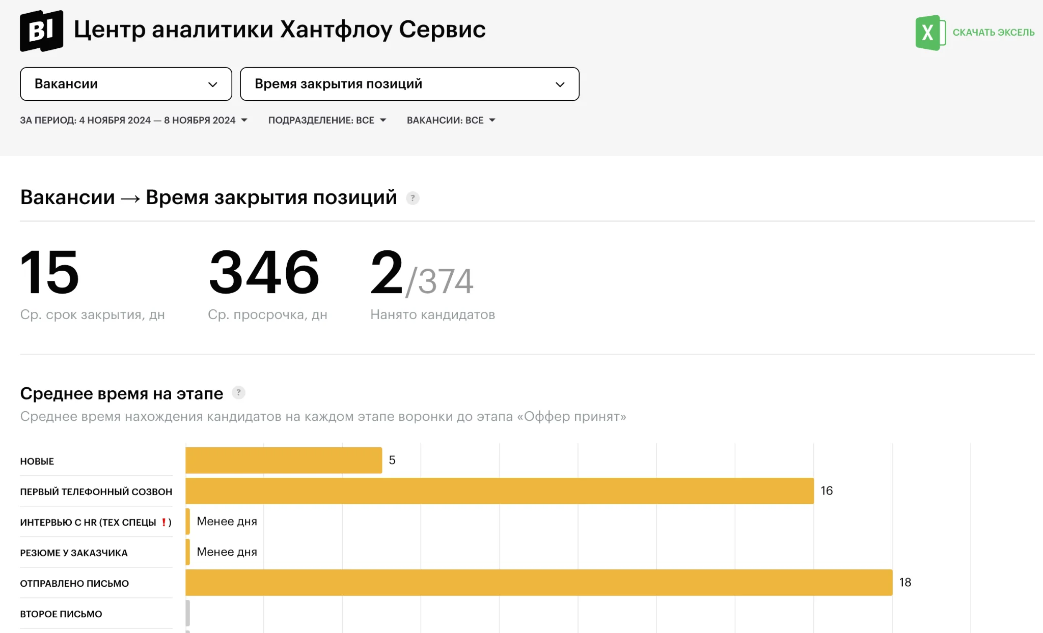 - Отслеживать эффективность команды найма и SLA в реальном времени — видеть, где возникают задержки и принимать меры заранее