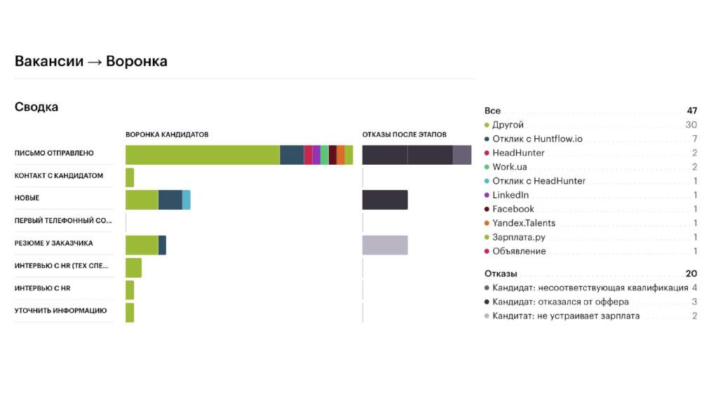 Один из самых полезных отчетов — по воронке. В Хантфлоу воронка строится на ваших собственных данных: вы сами настраиваете этапы подбора, источники и причины отказов. Поэтому аналитика получается максимально понятной и управляемой: вы всегда можете «провалиться» в любой показатель и увидеть его детализацию.