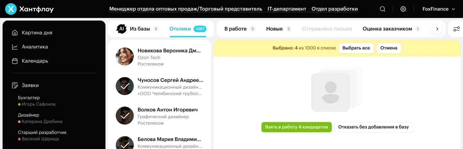 В Хантфлоу это решается через массовый разбор откликов: можно выделить сразу до 1000 откликов, взять их в работу или отказать. Функция помогает быстрее разбирать отклики, отвечать всем кандидатам и поддерживать высокий индекс вежливости на hh.ru.