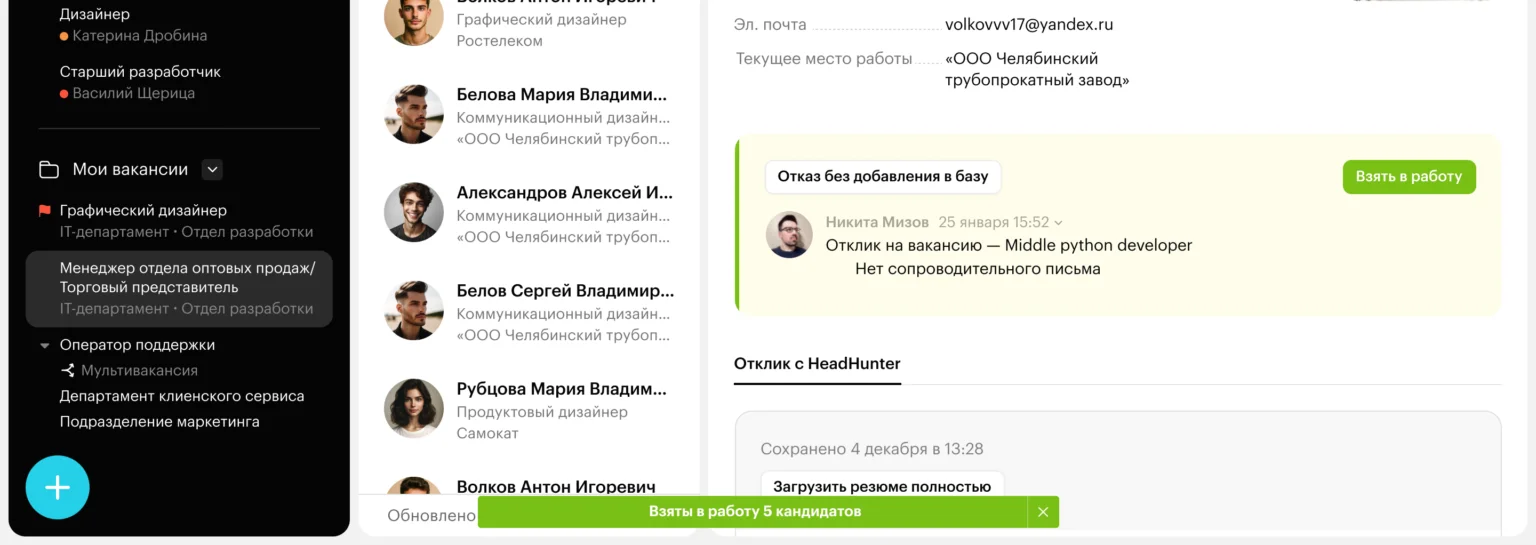 Когда откликов становится больше, выигрывает рекрутер, у кого лучше выстроена обработка. Например, когда можно разом разобрать весь входящий поток: взять в работу нужных кандидатов, а остальным отказать.