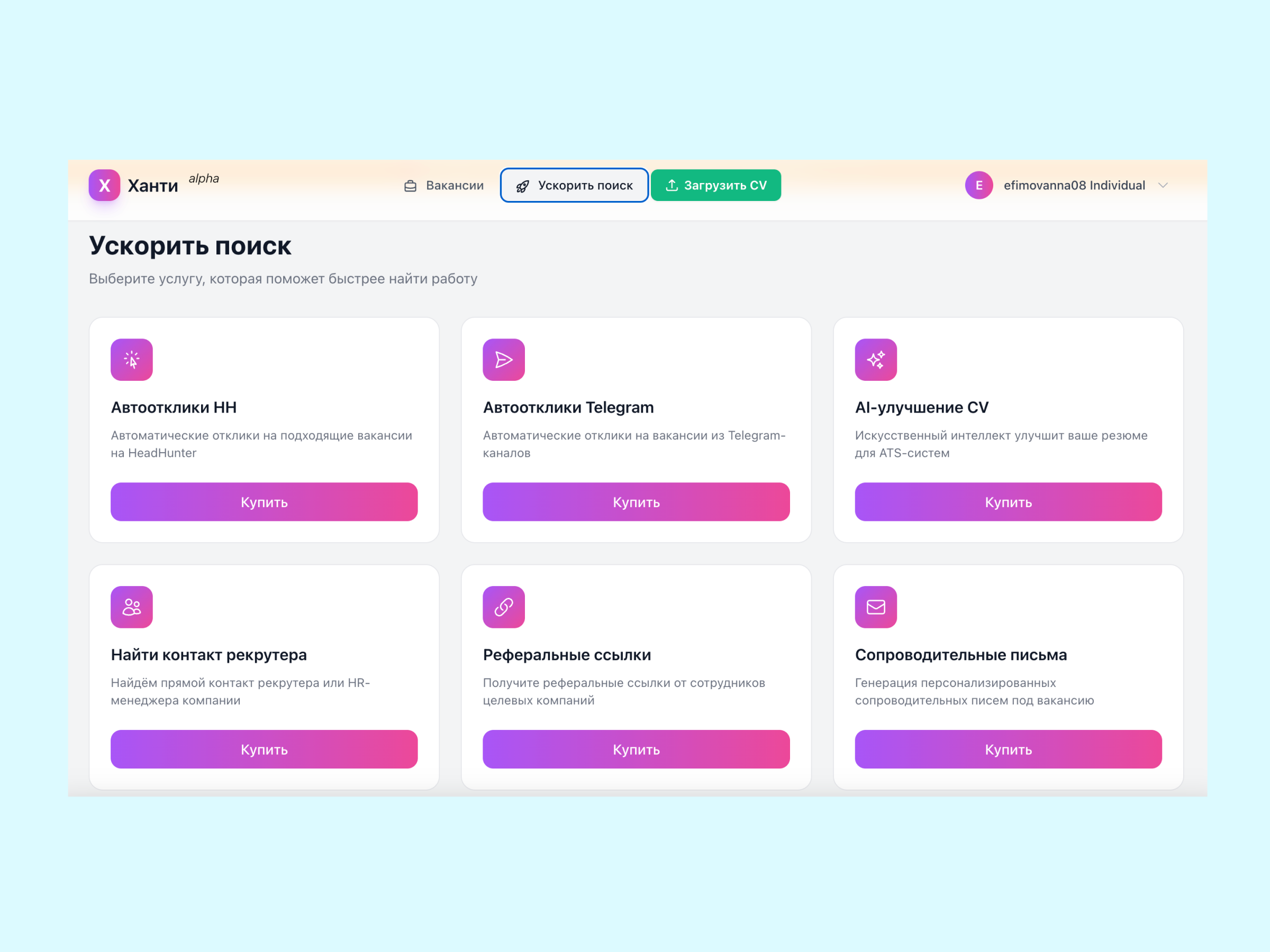 На первом фото — личный кабинет кандидата в Huntee. На втором — дополнительные опции, которые может купить кандидат: например, рассылка автооткликов на hh.ru и в телеграме, а также получение личного контакта рекрутера.