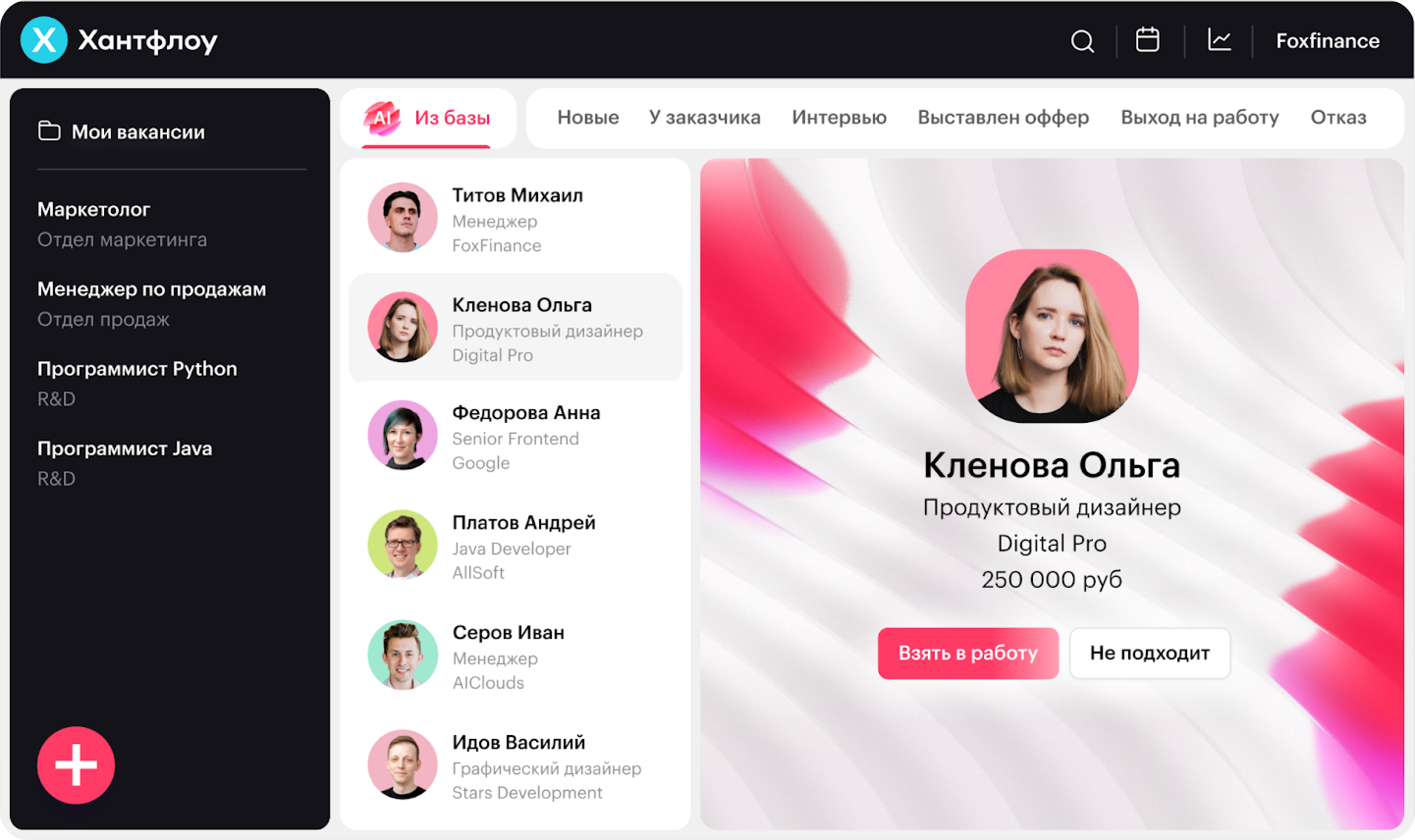 Чтобы начать работать с рекомендациями от Хантфлоу AI, просто откройте раздел «Из базы» в вакансии. Затем откройте карточку выбранного кандидата «Из базы» и возьмите его в работу — или нажмите кнопку «Не подходит». Если кандидат будет взят в работу, информация о том, что его порекомендовал Хантфлоу AI, отобразится в его карточке.