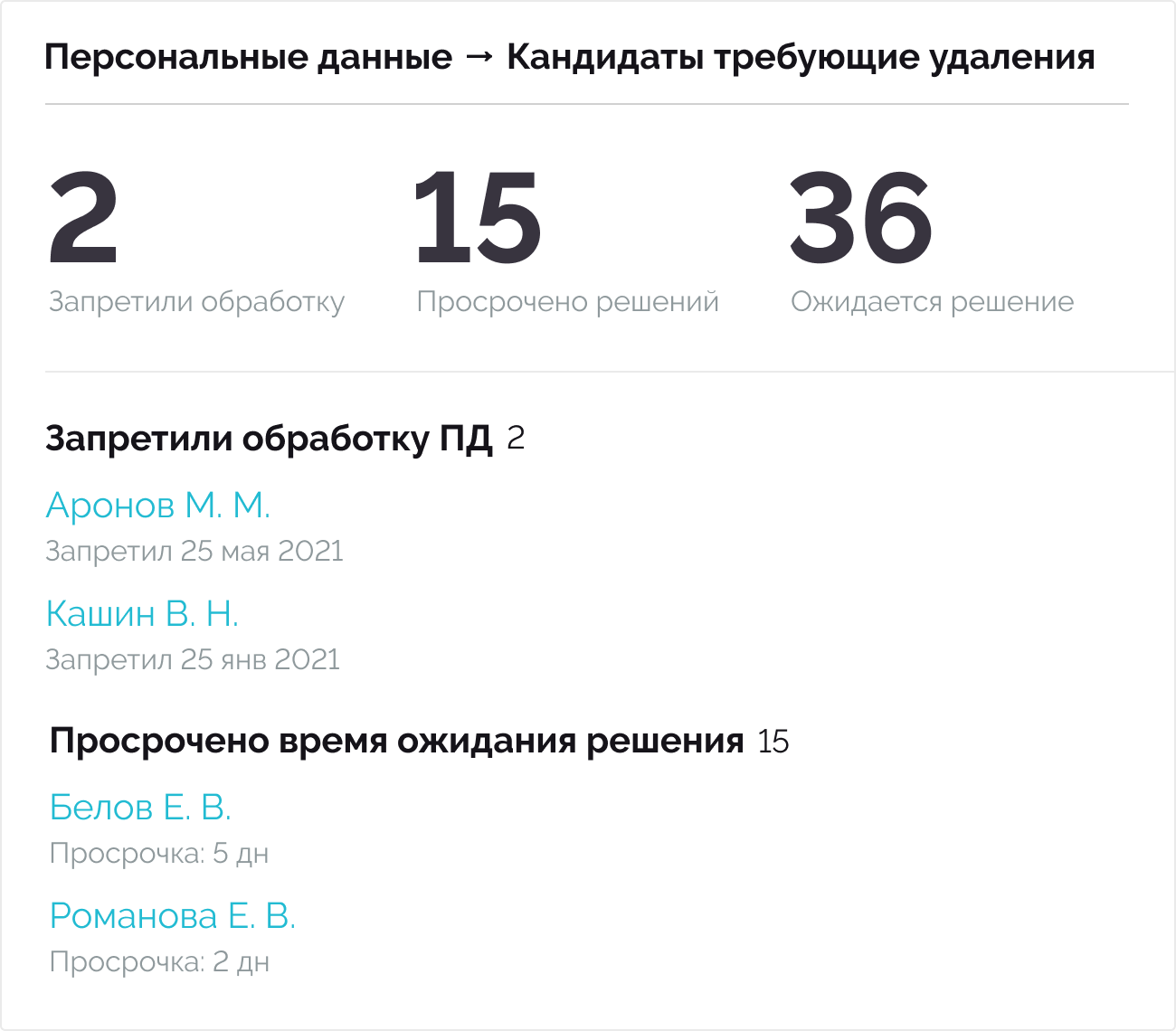 С отчетом по персональным данным вы всегда будете в курсе, у кого из кандидатов есть актуальное разрешение. А ваш юрист наконец-то перестанет вздрагивать при слове «Роскомнадзор». Еще в этом отчете вы сразу видите кандидатов, которые затягивают с ответом.