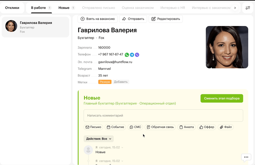 Ответы кандидатов также сразу попадают в Хантфлоу.