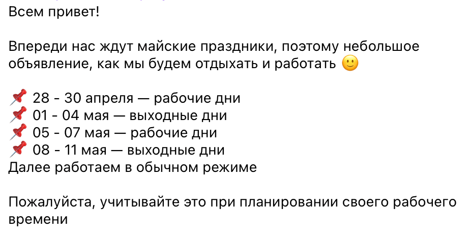 - За несколько дней до праздников в общем канале команды напишите, какие дни будут нерабочими
