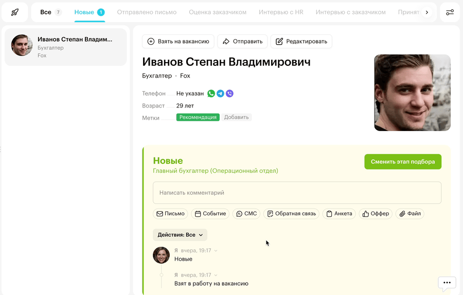 | Переписка с кандидатами в пяти мессенджерах | Вся коммуникация хранится в карточке кандидата |