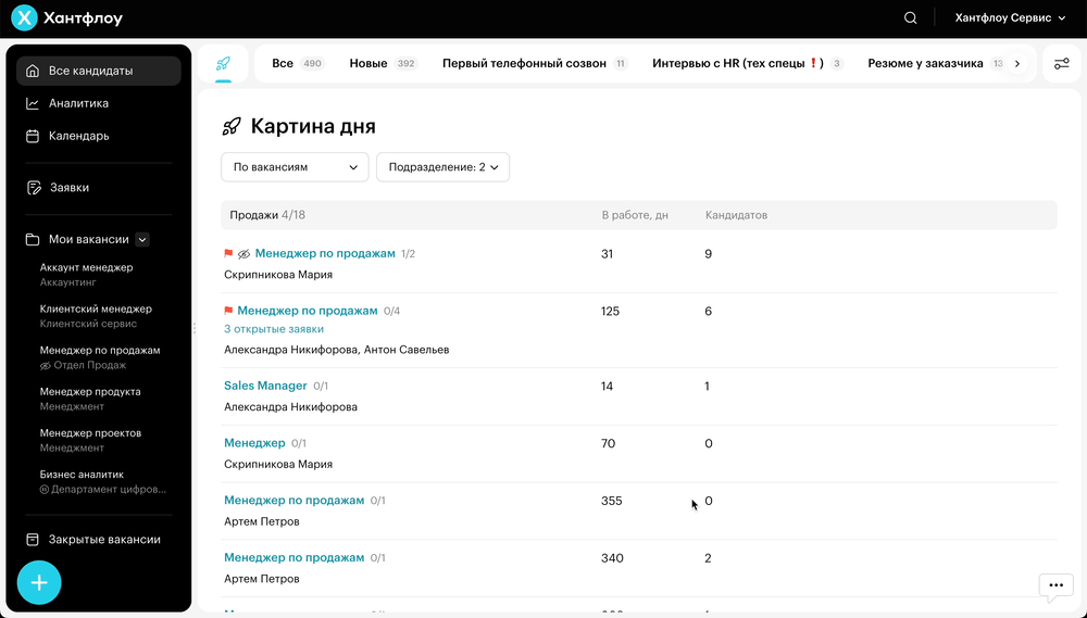 Проще и быстрее собирать данные о воронке в системе, которая для этого и создана — такой, как Хантфлоу. Сервис наглядно показывает весь путь кандидата — от самого первого контакта с рекрутером до выхода на работу.