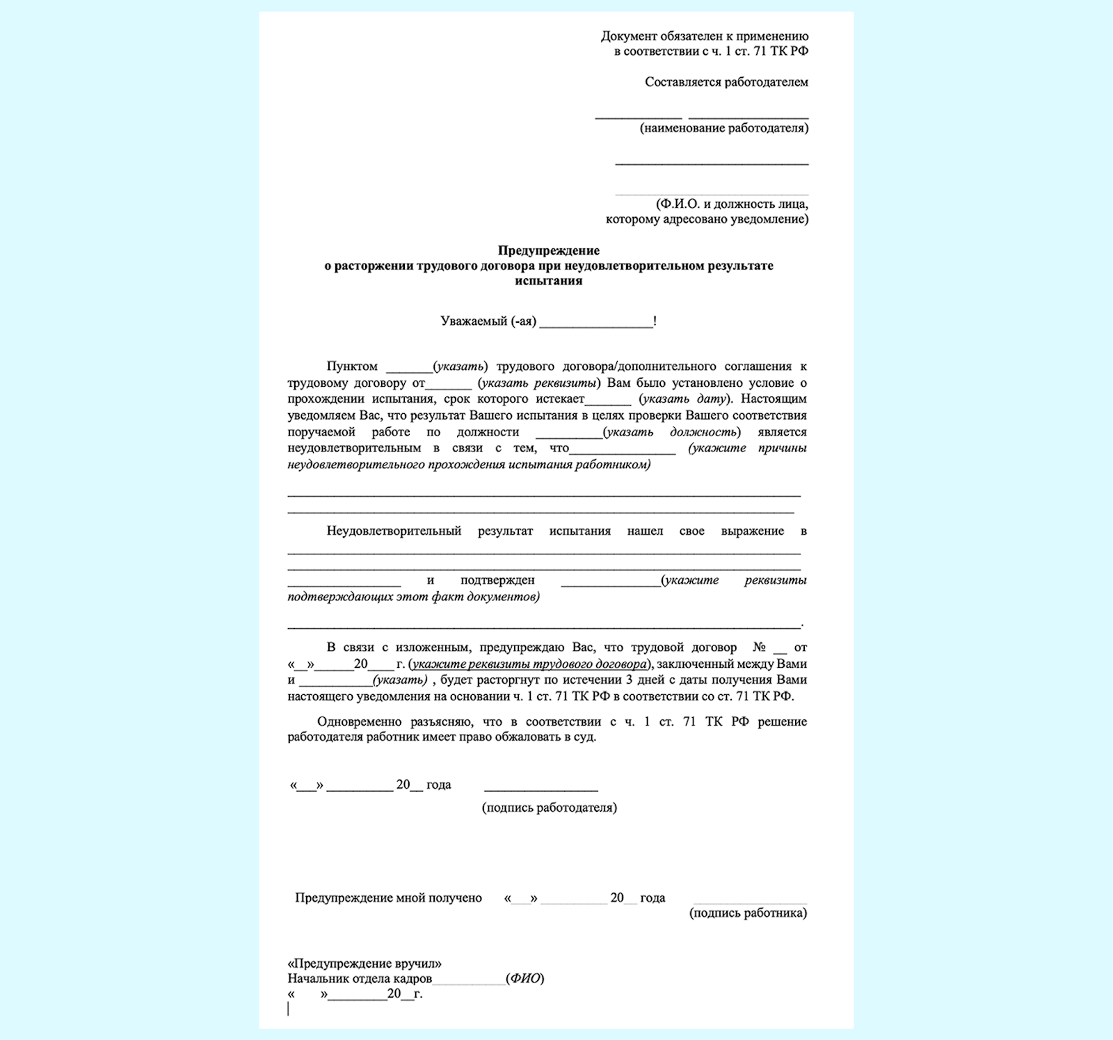 - Соблюдение сроков. Уведомляйте сотрудника письменно не позднее чем за 3 календарных дня до истечения срока испытания