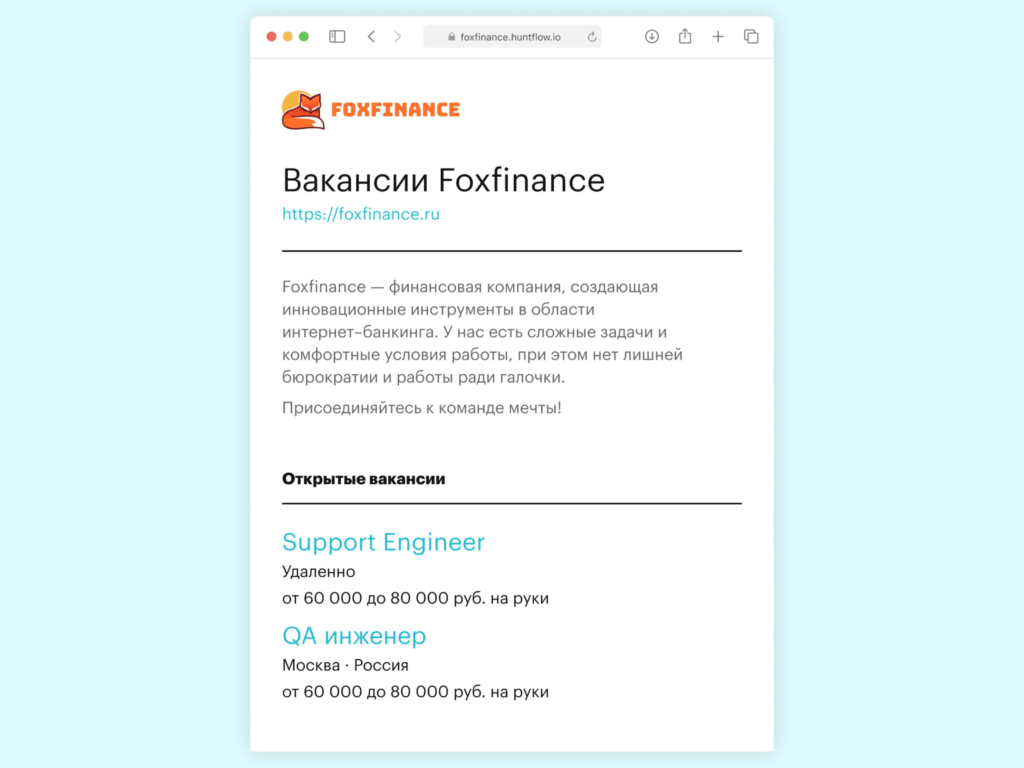 Встроенный карьерный сайт в Хантфлоу — это готовая страница компании с вакансиями, которая создается прямо внутри рекрутинговой CRM. Она не требует разработки, отдельного дизайна и интеграций с Хантфлоу.