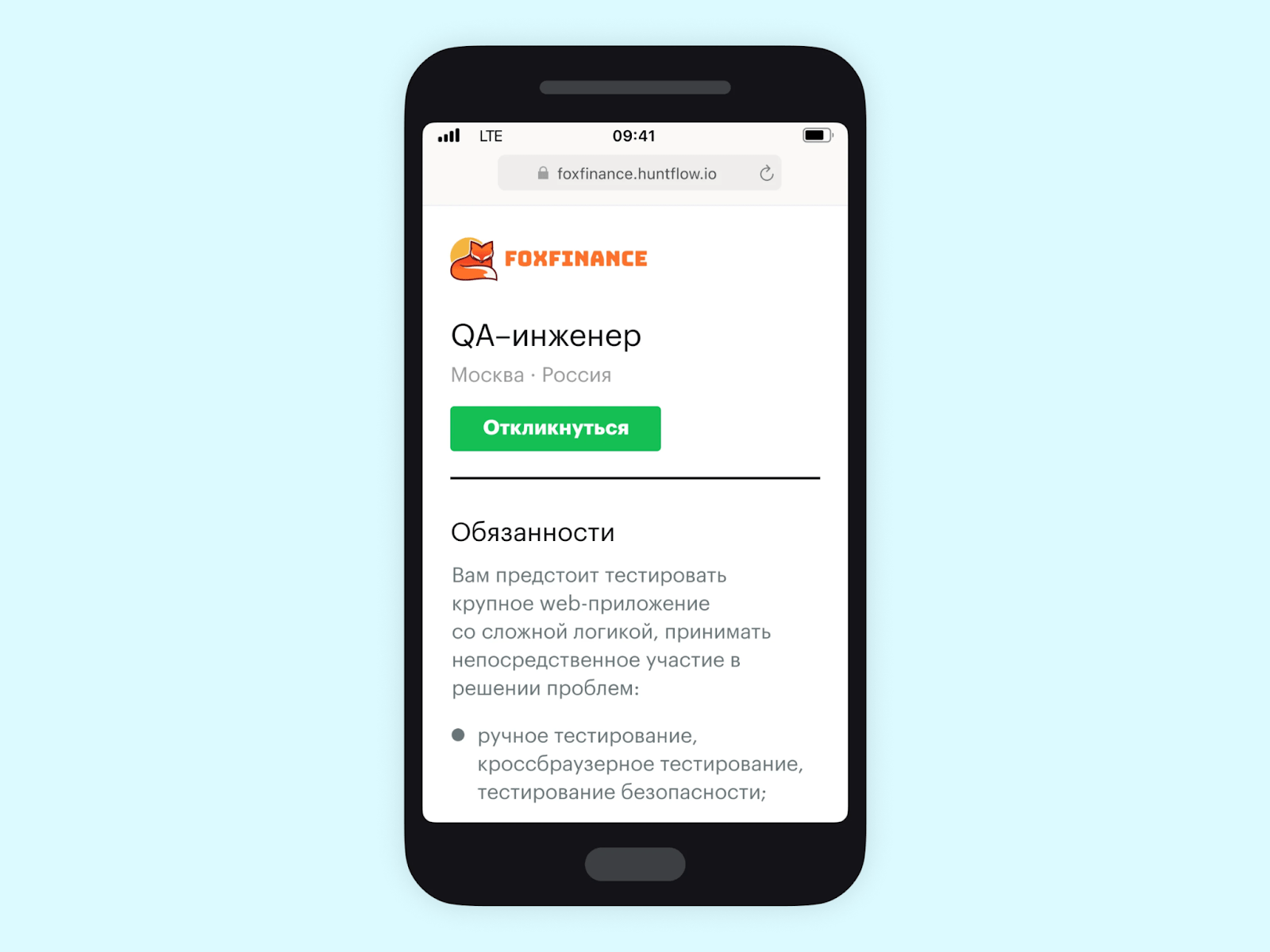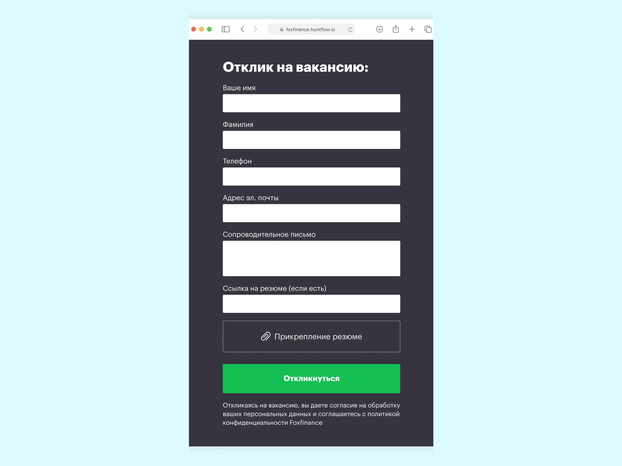 Отклики сразу прилетают в Хантфлоу. Кандидаты откликаются напрямую через карьерный сайт, а их данные автоматически попадают в Хантфлоу. Это избавляет от ручного переноса резюме и снижает риск потери нужной информации.