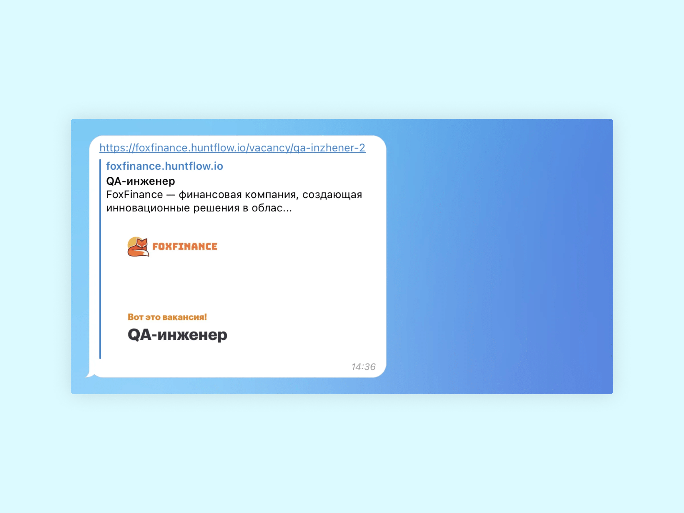 Красивое и информативное отображение при пересылке. Для каждой вакансии генерируется обложка с логотипом вашей компании и крупным названием вакансии, чтобы привлечь внимание потенциальных кандидатов.