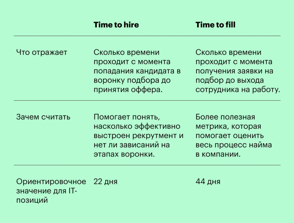 💡 Лучше измерять срок закрытия позиции — Time to Fill. В отличие от Time to Hire, этот показатель считает дни от момента, когда заявка поступила рекрутеру в работу, до момента, когда кандидат вышел на работу или принял оффер.