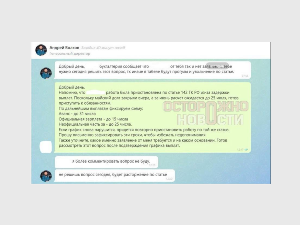 Когда сотрудник попытался воспользоваться правом приостановить работу из-за задержки зарплаты (ст. 142 ТК РФ), генеральный директор компании Андрей Волков пригрозил увольнением. Бухгалтерия же предлагала оформить отпуск за свой счет.