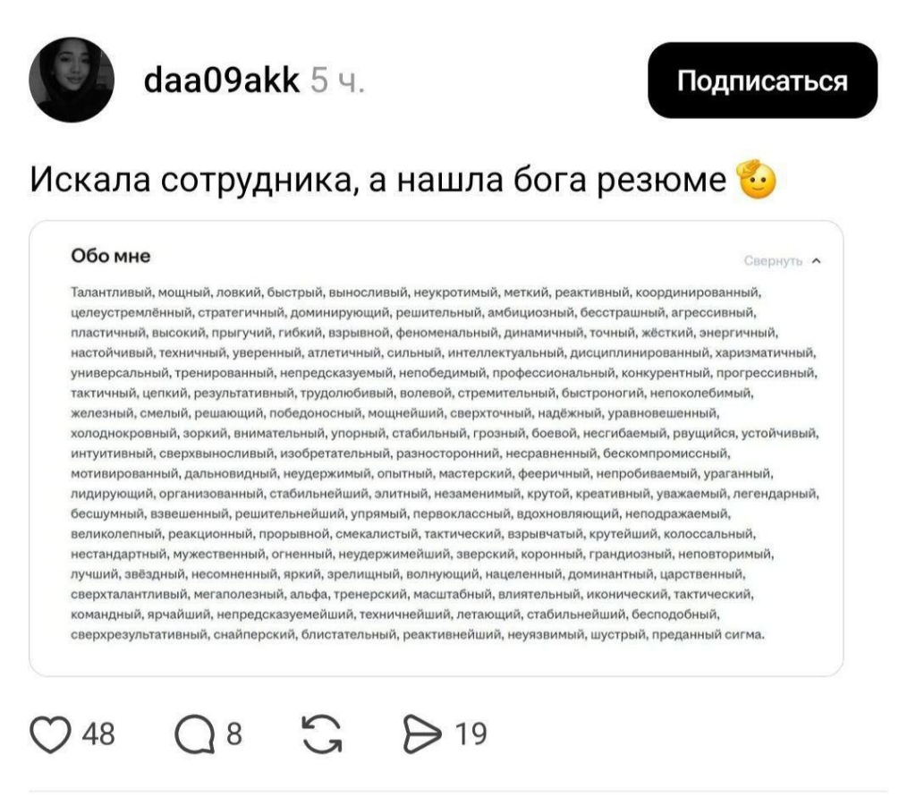 Хотите больше мемов про офисную жизнь, свежих идей для HR и полезных материалов о рекрутинге? Подписывайтесь на телеграм-канал Хантфлоу — там каждый день что-то новое: от веселых постов до инструментов, которые реально помогают в работе.