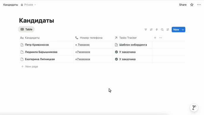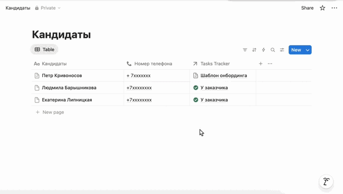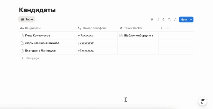 Если у вас есть отдельные базы, например, «Кандидаты» и «HR-документы», их можно связать. Тогда к карточкам кандидатов можно будет прикрепить шаблон онбординга, а в шаблоне отразится, кто сейчас его проходит.