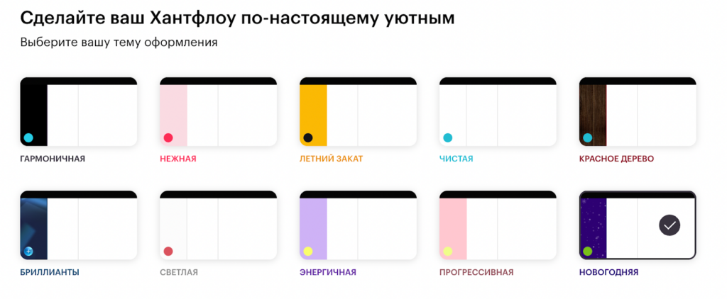 Это лишь одна из 10 тем оформления Хантфлоу. Выбирайте стиль, который вам по душе, ведь с Хантфлоу вы сами решаете, как будет выглядеть ваше главное рабочее пространство.