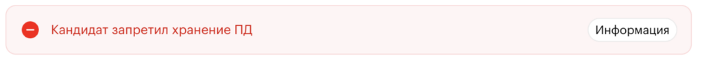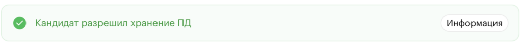 Если кандидат дает согласие, в карточке кандидата статус меняется на положительное решение. Если кандидат запрещает обработку персональных данных, в карточке отображается отказ. Если вы за 30 дней не получили согласия, модуль будет подсвечивать текст о запросе красным и рекомендовать удалить кандидат» или отправить запрос повторно.