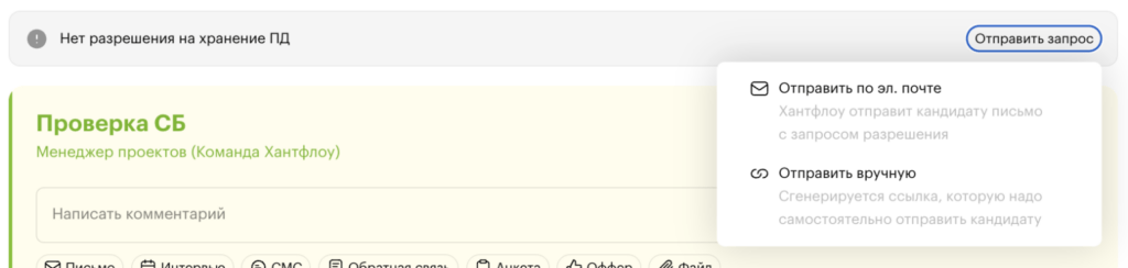 Если кандидат дал согласие через систему автоматизации рекрутмента Хантфлоу, в сервисе это фиксируется. Также учитывается, когда было дано согласие и каким способом. Это вполне обоснованное подтверждение для проверяющих органов.