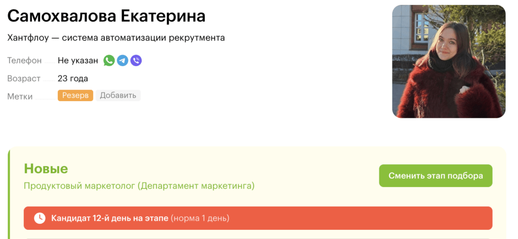 - Подсветит просрочку обратной связи в карточке кандидата — там, где хранится резюме и история общения со специалистом. Если фидбэк задерживается, в карточке кандидата будет большая красная плашка — ее невозможно не заметить
