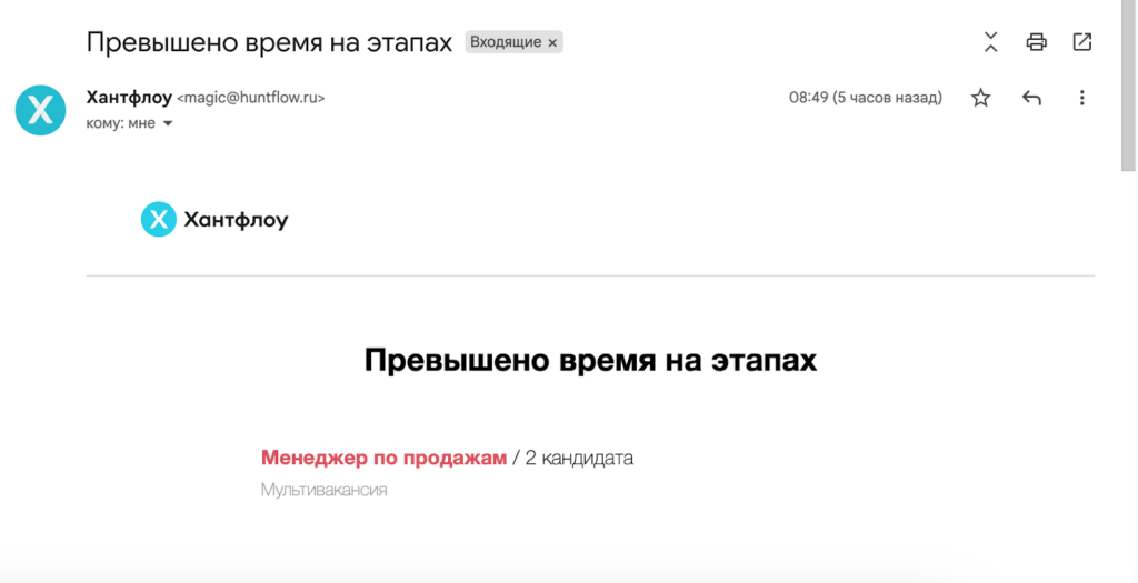 Хантфлоу упорядочивает уведомления, чтобы они не спамили, а помогали заказчикам своевременно принимать решения по этапам и кандидатам.