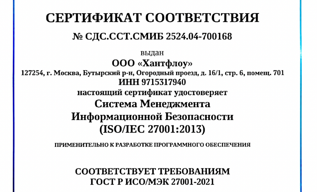 Хантфлоу — система автоматизации рекрутмента, которая ежегодно подтверждает защиту данных от утечек. 21 октября 2025 года Хантфлоу получил сертификат соответствия системе менеджмента информационной безопасности. Это значит, что резюме, контакты и комментарии в системе надежно защищены и не попадут в руки посторонних.