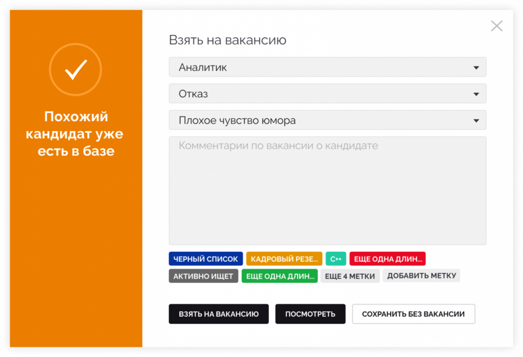 А если такой кандидат уже был сохранен — Хантфлоу вежливо предупредит вас о дубликате. Никаких повторов и путаницы.