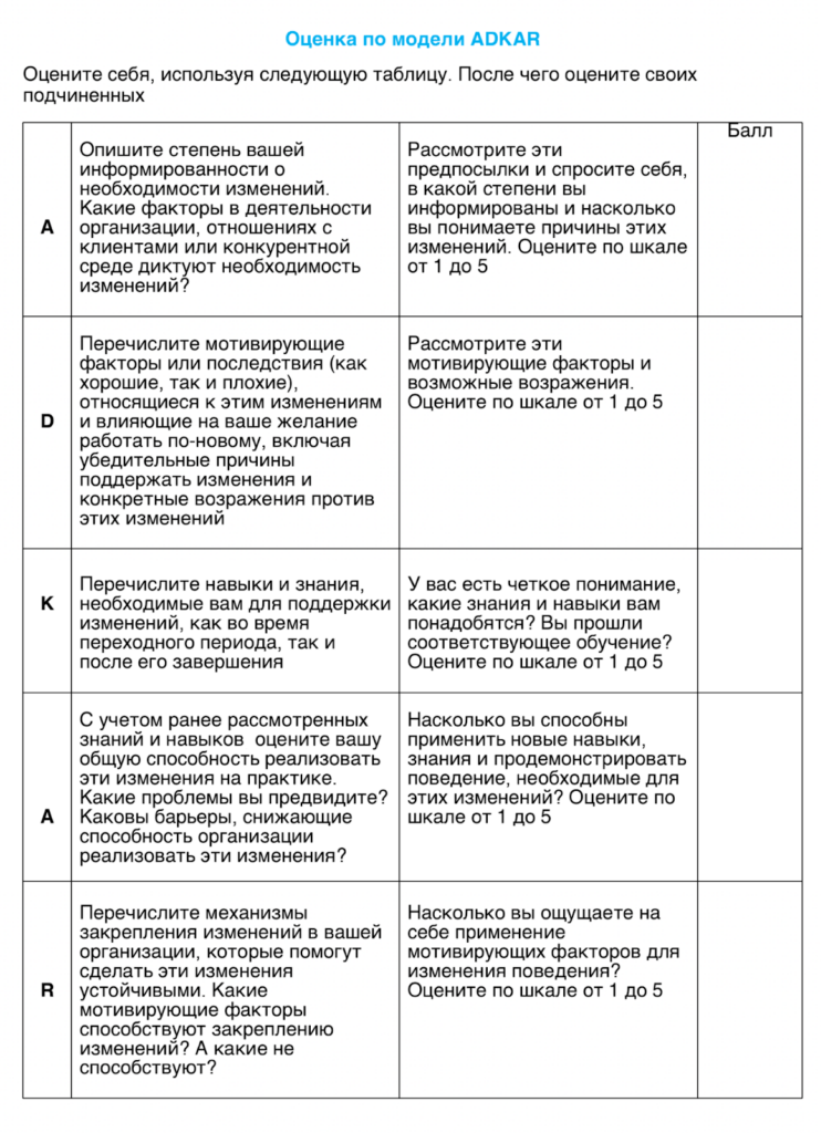 Чек-лист можно использовать до и после применения ADKAR. Вопросы из левого столбца позволят узнать опасения и степень готовности сотрудников к изменениям. С помощью вопросов из правого столбца можно впоследствии провести ретроспективу — оценить, насколько качественно проделана работа. Чем ниже балл, тем больше ошибок допущено.