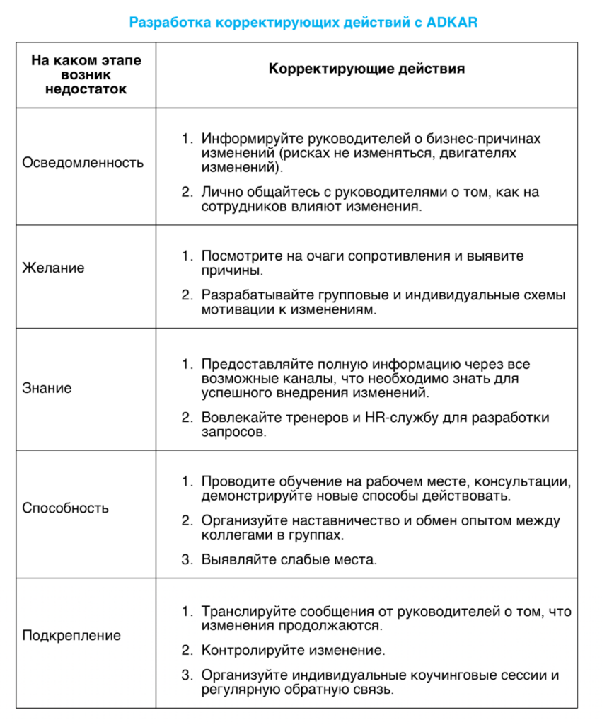 Модель ADKAR помогает сформировать план действий для внедрения изменений. Ядро модели — работа с людьми, которые задействованы в трансформациях. С помощью ADKAR можно донести важность изменений, справиться с саботажем сотрудников и поддержать мотивацию работать по-новому.