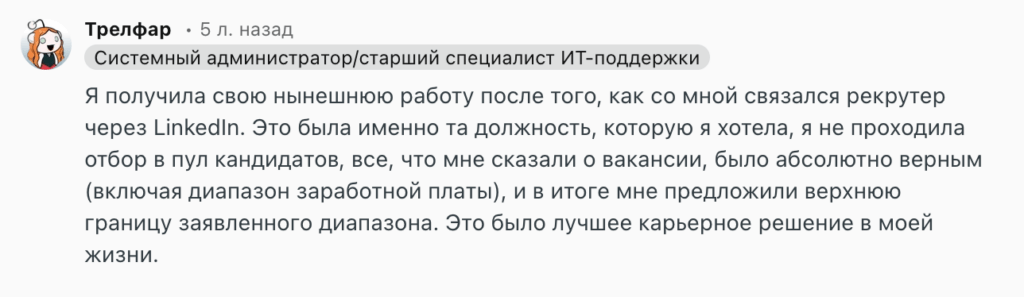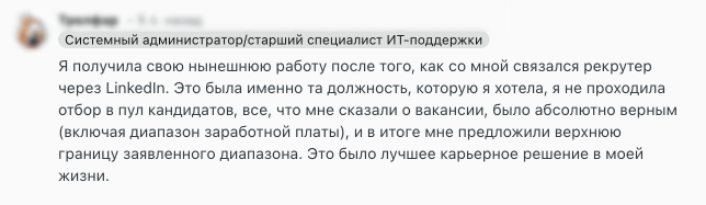 Одна из кандидаток рассказывает, что получила работу после сообщения от рекрутера в LinkedIn. Это была именно та роль, которую она давно искала.