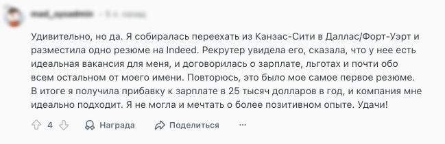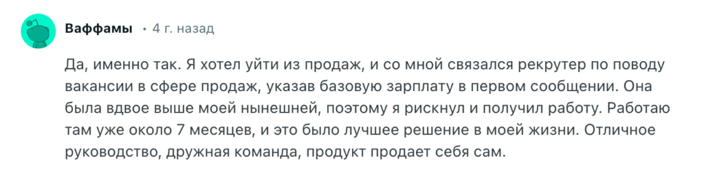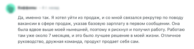 Кандидат хотел уйти из продаж, но откликнулся на сообщение рекрутера, где была указана зарплата вдвое выше его текущей. Он рискнул, прошел отбор и получил работу.
