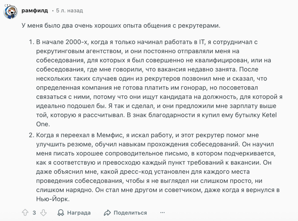 Один из пользователей Reddit вспоминает, как рекрутер помог ему переработать резюме, научил писать сопроводительные письма и готовиться к интервью. Он подробно объяснял, как отвечать на вопросы, и даже подсказывал дресс-код для разных компаний, чтобы кандидат выглядел уместно.
