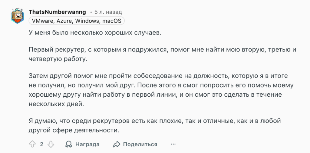 Один из кандидатов рассказывает, что первый рекрутер помог ему найти вторую, третью и четвертую работу в карьере. Позже другой рекрутер помог пройти собеседование его другу — и тот получил оффер всего за несколько дней.