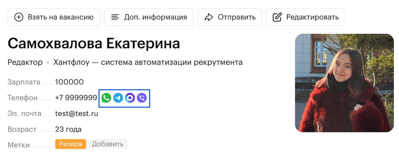 В один клик рекрутеры Туту переходят в чат с кандидатом в любом популярном мессенджере. Это помогает быстрее отправлять приглашения холодным кандидатам или специалистам на массовые вакансии, без лишних копирований и переключений между приложениями.