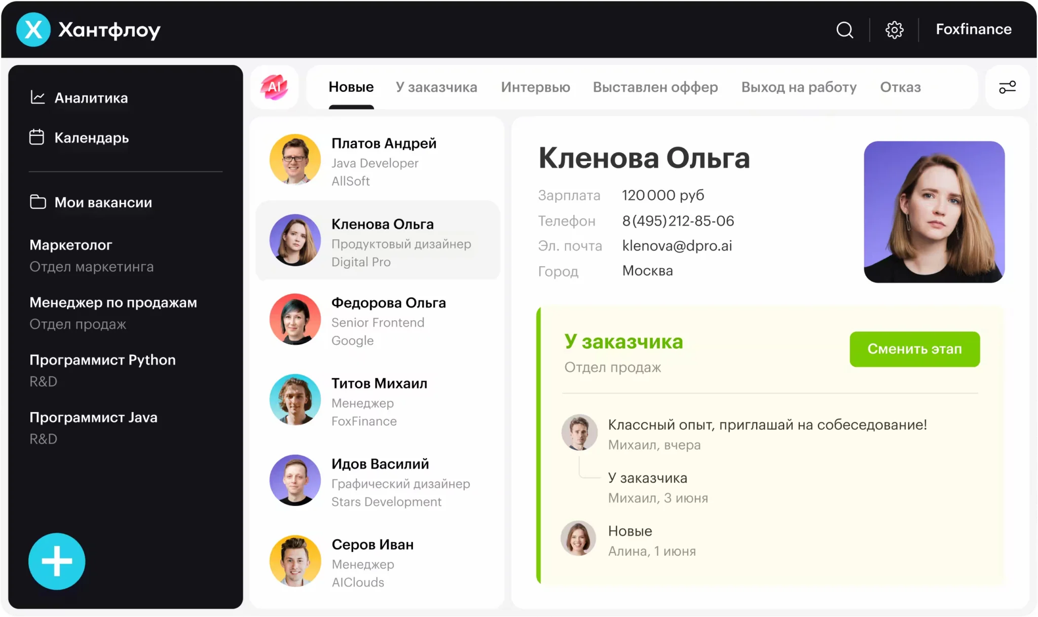 - Закрывайте вакансии с помощью ИИ. ИИ в Хантфлоу анализирует поведение рекрутера в системе и предлагает ему теплых кандидатов прямо из его базы.