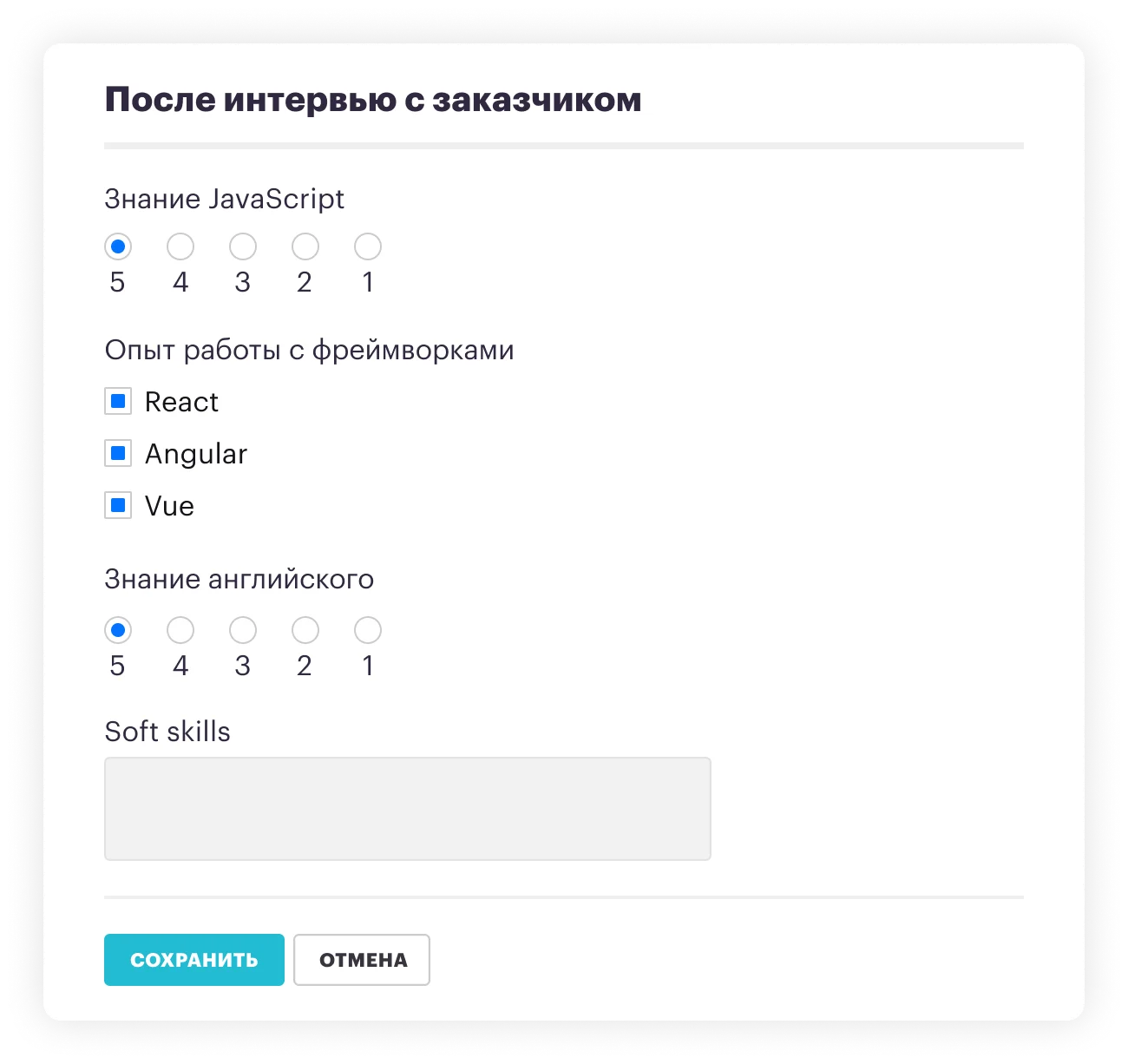 - Давайте кандидату структурированную обратную связь. В Хантфлоу есть специальные формы обратной связи, которые помогают заказчикам оставлять понятный и развернутый фидбэк о кандидате.